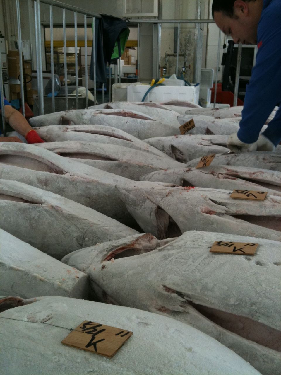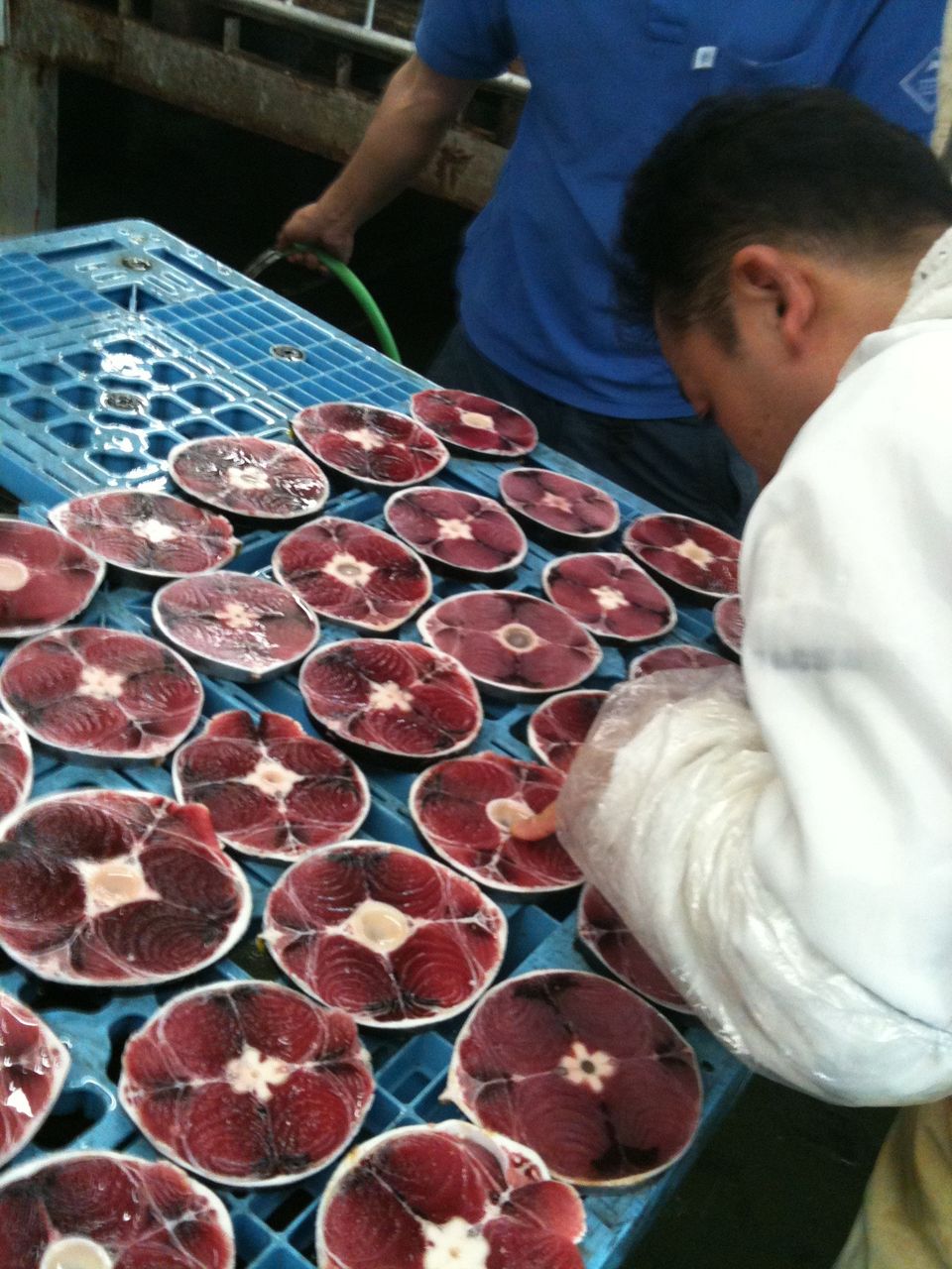 ランクに分けたマグロをタグ付。バルク(まとめて)買ったマグロはこの流れでランク分けされていきます。