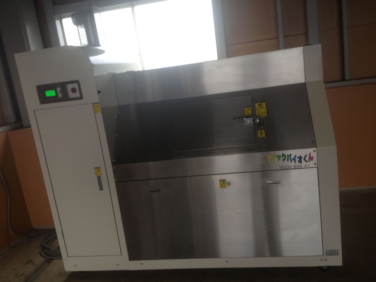 それだと面白くないので、こちらのマジックバイオ君は当社の『たいようのまぐろプロジェクト』の一環として同パネルがある施設内に設置しました。この機械を動かすエネルギーは基本的に太陽光でのエネルギーでまかないます!!