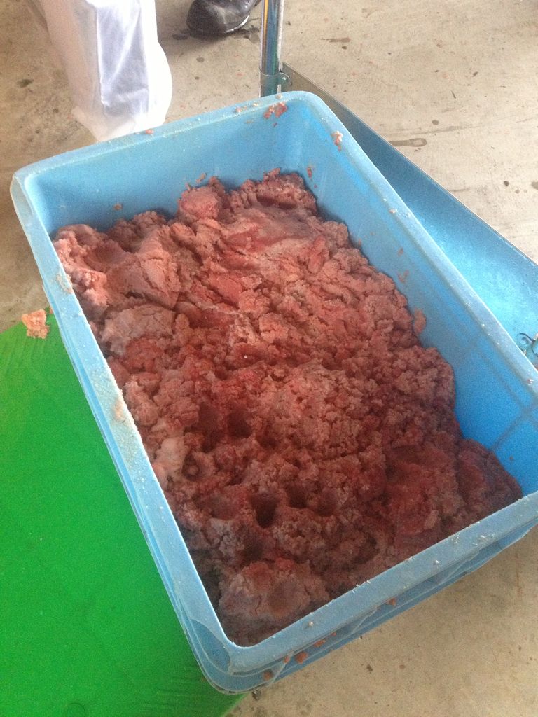 それでも10%弱(骨であったり、ほほ肉などが外された頭であったり、バンドソーの切り粉であったり)が食用にならず飼料屋に買いとられていきます。その先はどうなっているか分かりません。。。