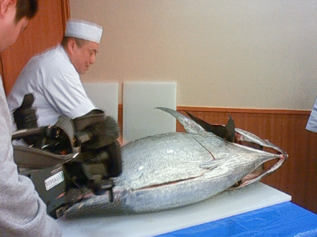 またオープン初日に90キロクラスの本鮪の解体ショーを実施しました。