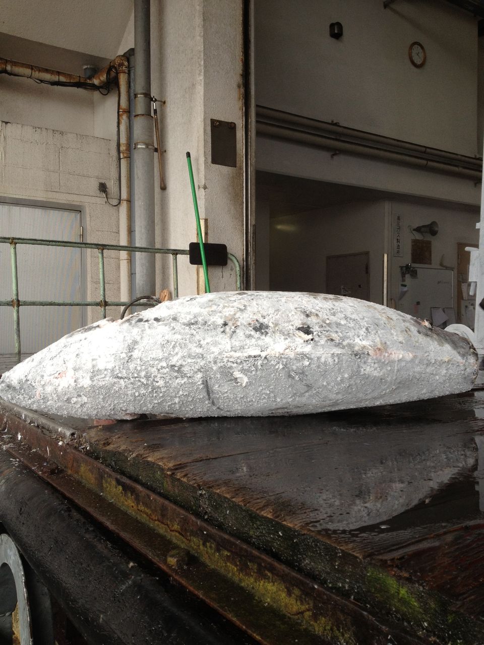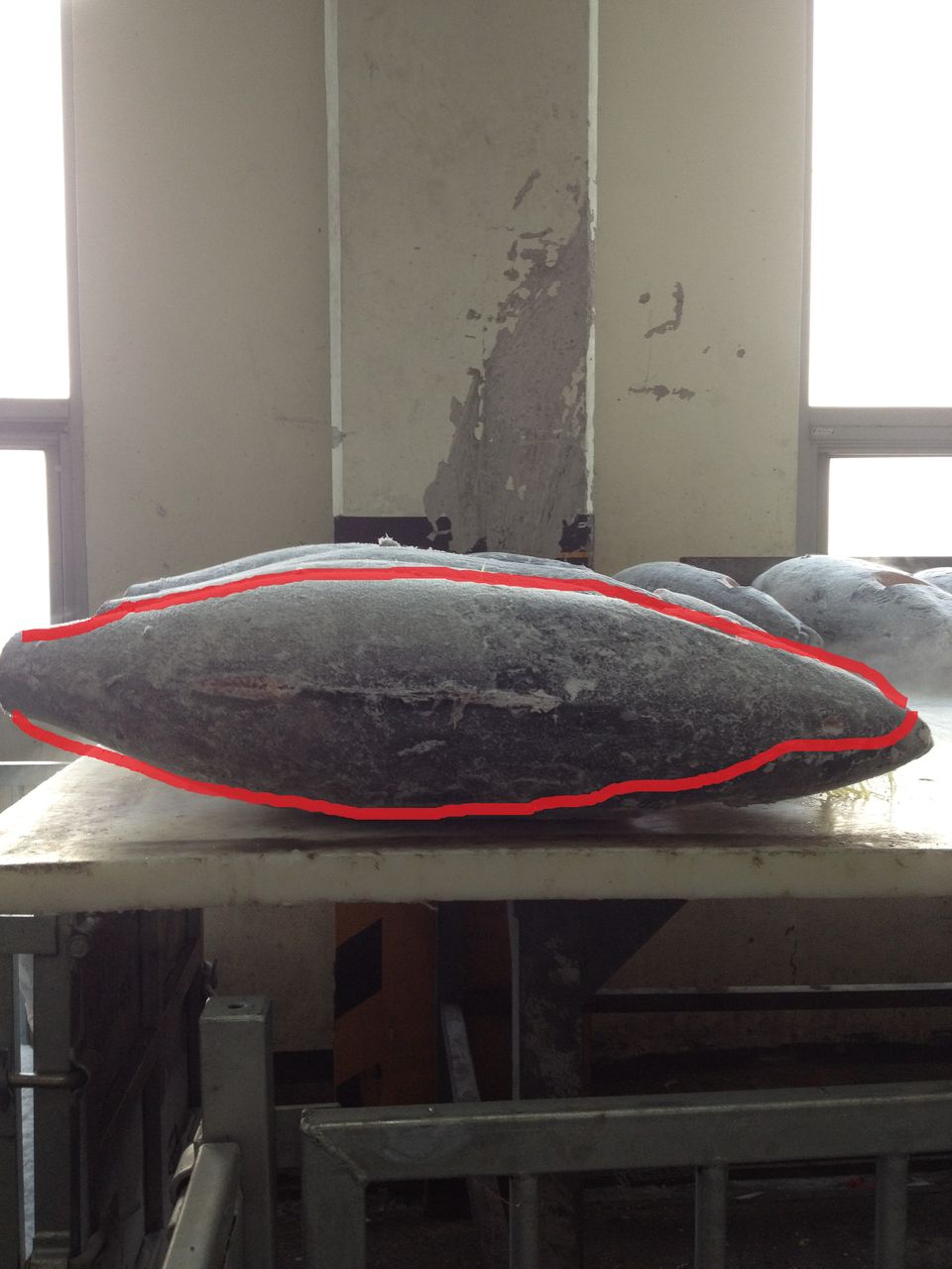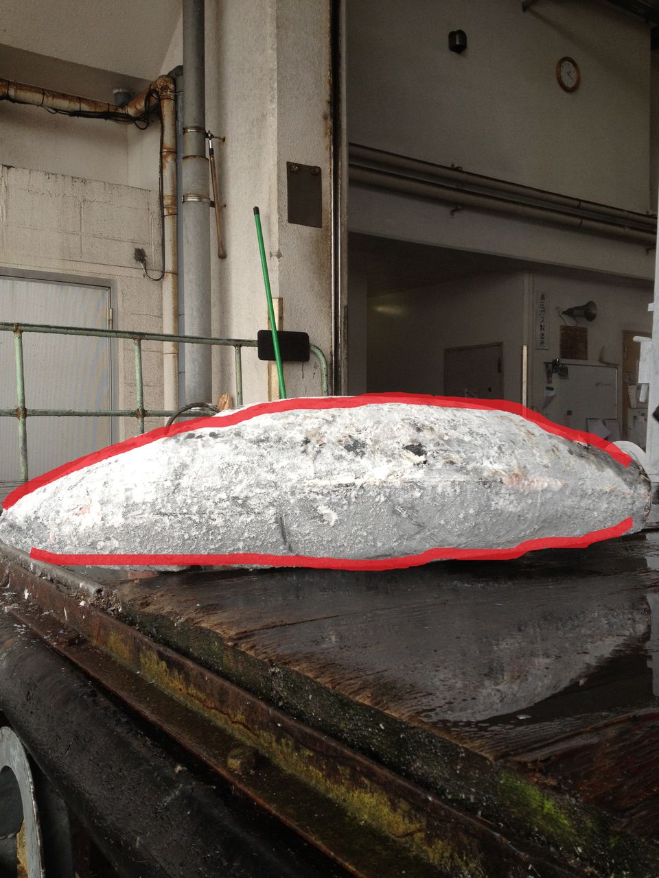 その状態で急速冷凍かけられるので、上側も下側も曲線になります。ラッキョみたいな状態です。『上身、下見が無いマグロ』って事になります。