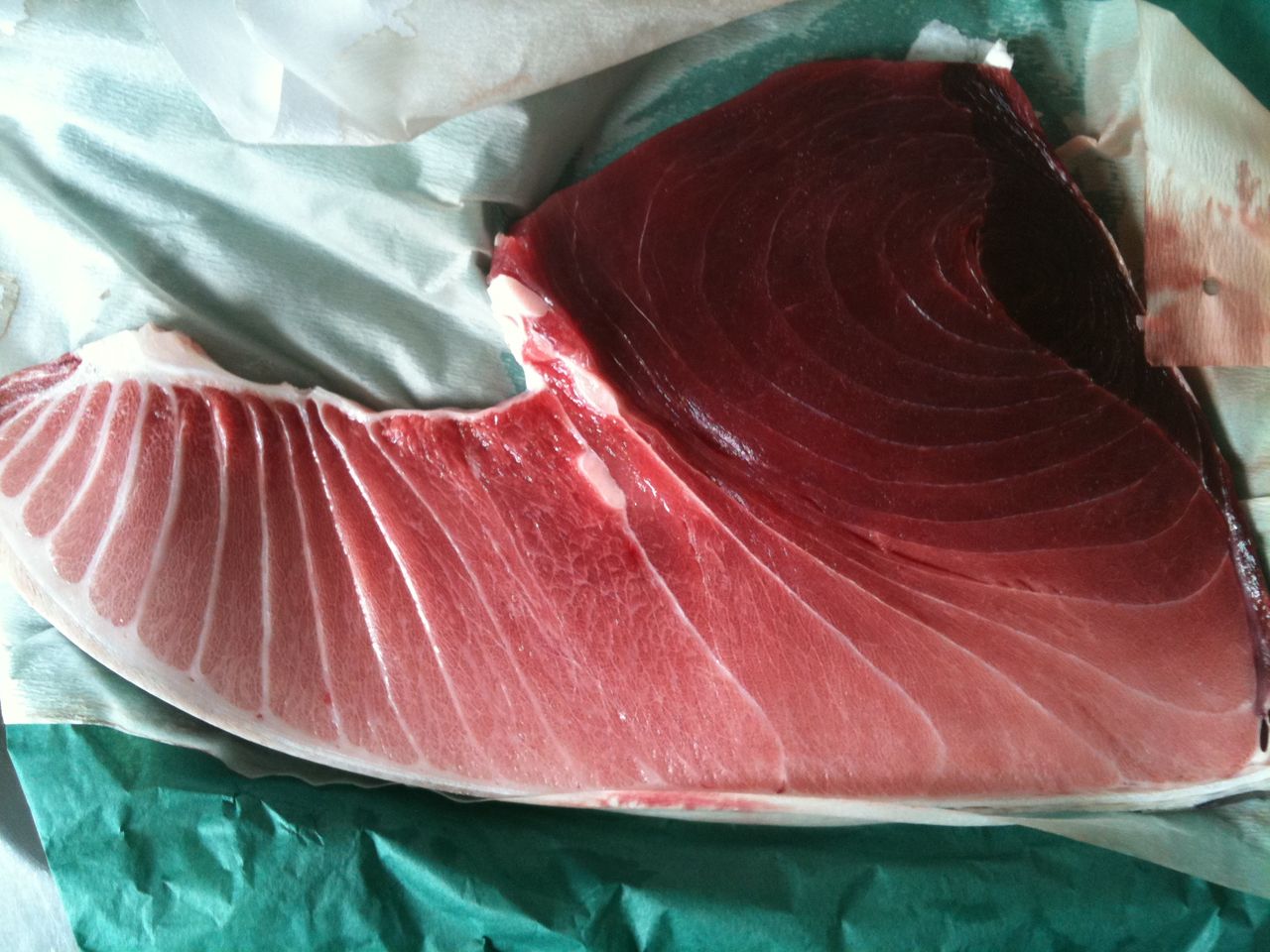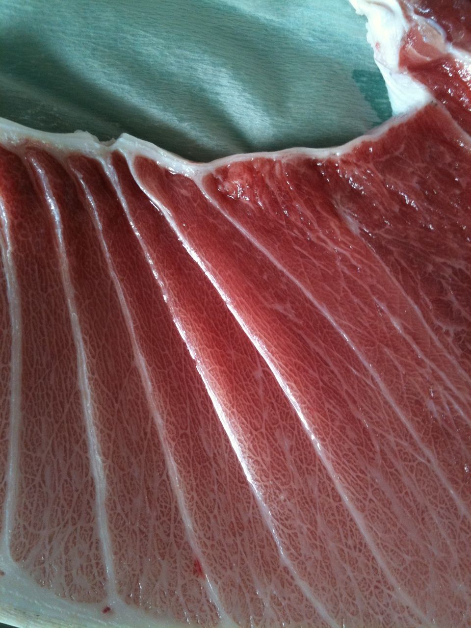先日のインドマグロを同上の加工で4つ割にし、検品の為大トロ部位をスライス。