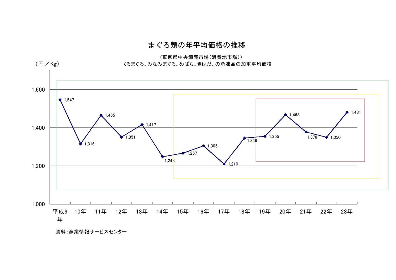 加重平均は何だとか?年によって取れる漁場の量が違うだろ?とかの議論は無しとすると、マグロの価格は間違いなく上下している。