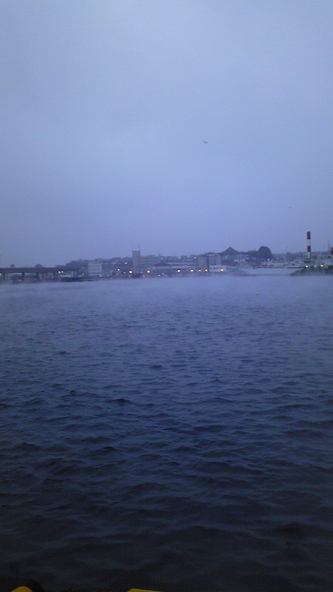 外気より海のほうが暖かいときにおこる現象ですね。北海道では「けあらし」と呼ばれ当たり前のようですが、温暖なここ三浦三崎港ではめったにみられません。