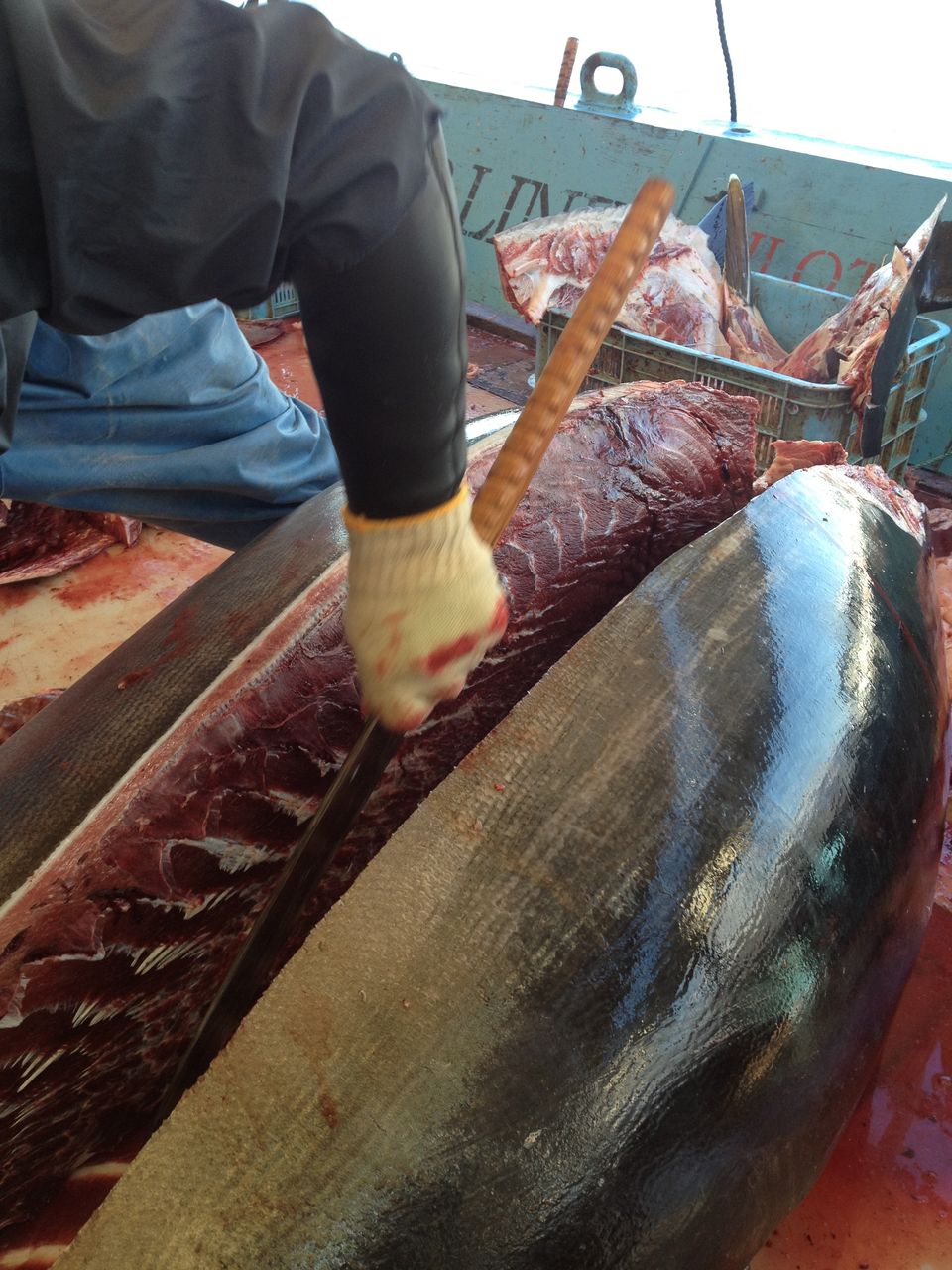 血が勢いよく飛び出し、包丁を入れると切り口から湯気(外気が寒くまぐろ自体が30度くらいの体温をもつ為)が出て、切った身を押すとビクビクって動くんです。